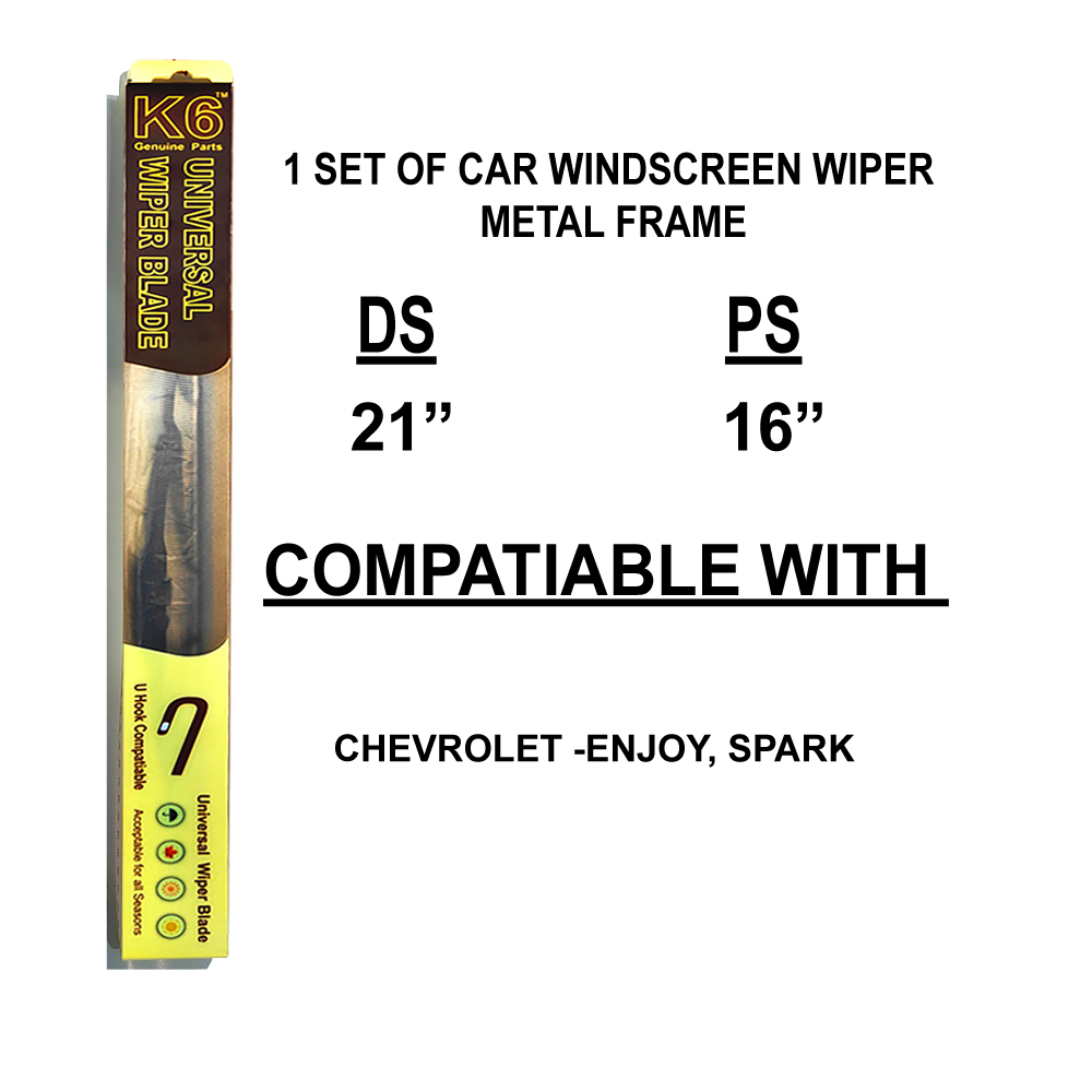 Tags: Chevrolet Spark, COMPATIABLE WITH Chevrolet Enjoy, K6 CAR WIPER BLADE 21" & 16" METAL FRAME, UNIVERSAL HOOK